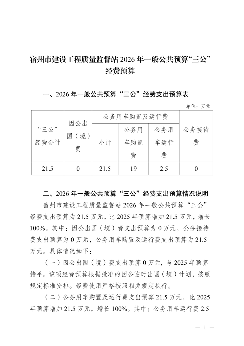 宿州市建设工程质量监督站2026年一般公共预算“三公”经费预算 |
