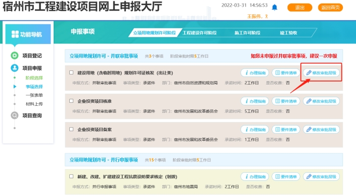 工程建设项目在“宿州市工程建设项目审批管理系统”进行项目登记时,应选择项目所在管理辖区,项目管理辖区应按项目实际坐落位置的建设规划行政管理辖区确定。项目的管理辖区确定后,经所在辖区工程建设综合窗口正式收件、办理审批后,项目全周期的管理辖区一般不允许变更。项目同一审批阶段的审批事项,通过“宿州市工程建设项目审批管理系统”,按照“一份办事指南,一张申请表单,一套申报材料,完成多项审批”的审批模式,采取“项目信息网上申报、申请材料一窗受理、审批过程并行协同、审批结果关联共享”等方式,由项目所在辖区工程建设项目综合窗口统一受理、协调督办、集中回复,相关部门审批事项同步审批办理,限时办结。