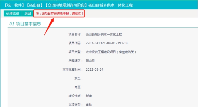 四、统一收件,仍然是由当前项目所属管理辖区对应阶段综合窗口进行,收件时会提示“该项目存在跨级申报请核实”的字样。