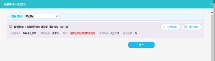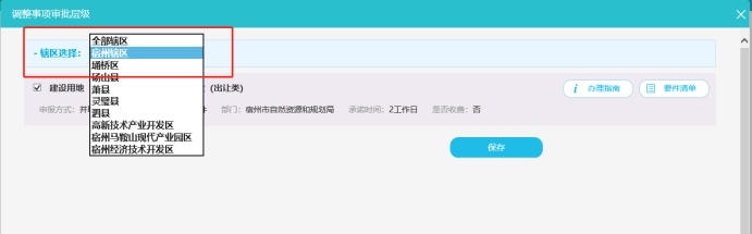 二、选择需要调整的审批辖区,会展示对应辖区下面的事项,勾选后点击保存(图3)