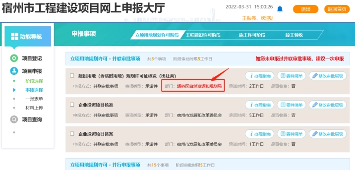 三、保存后可以看到,刚才勾选的事项,审批层级变成了埇桥区(图4),再选择其他需要办理的业务进行并联申报。