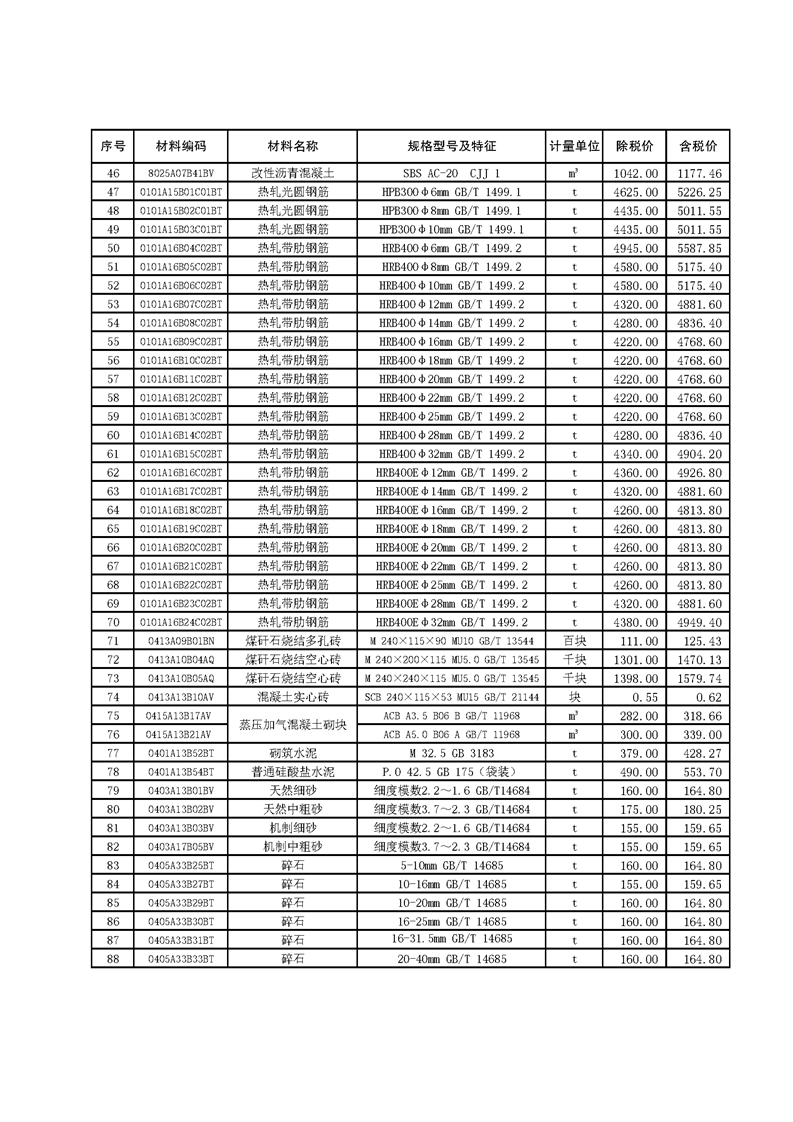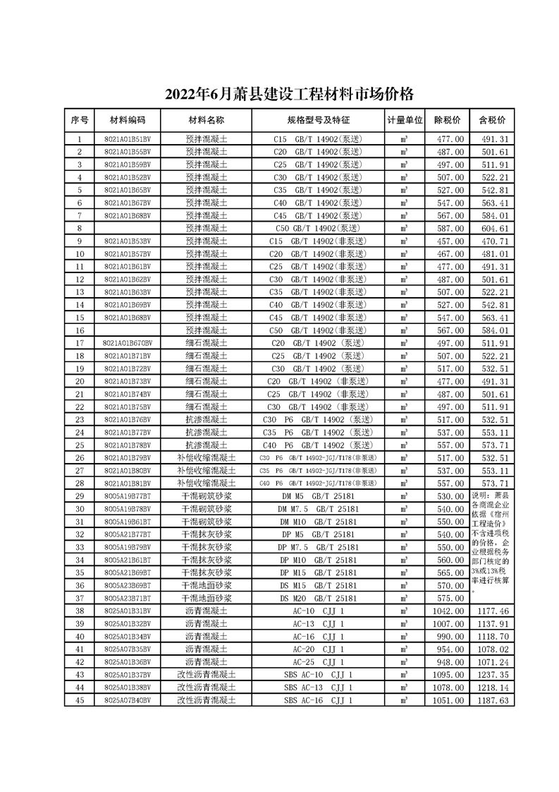 2022年6月萧县建设工程材料市场价格