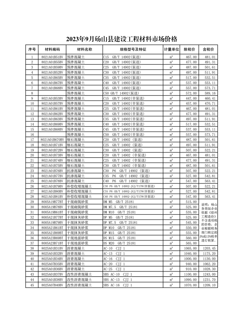 2023年9月砀山材料市场价格