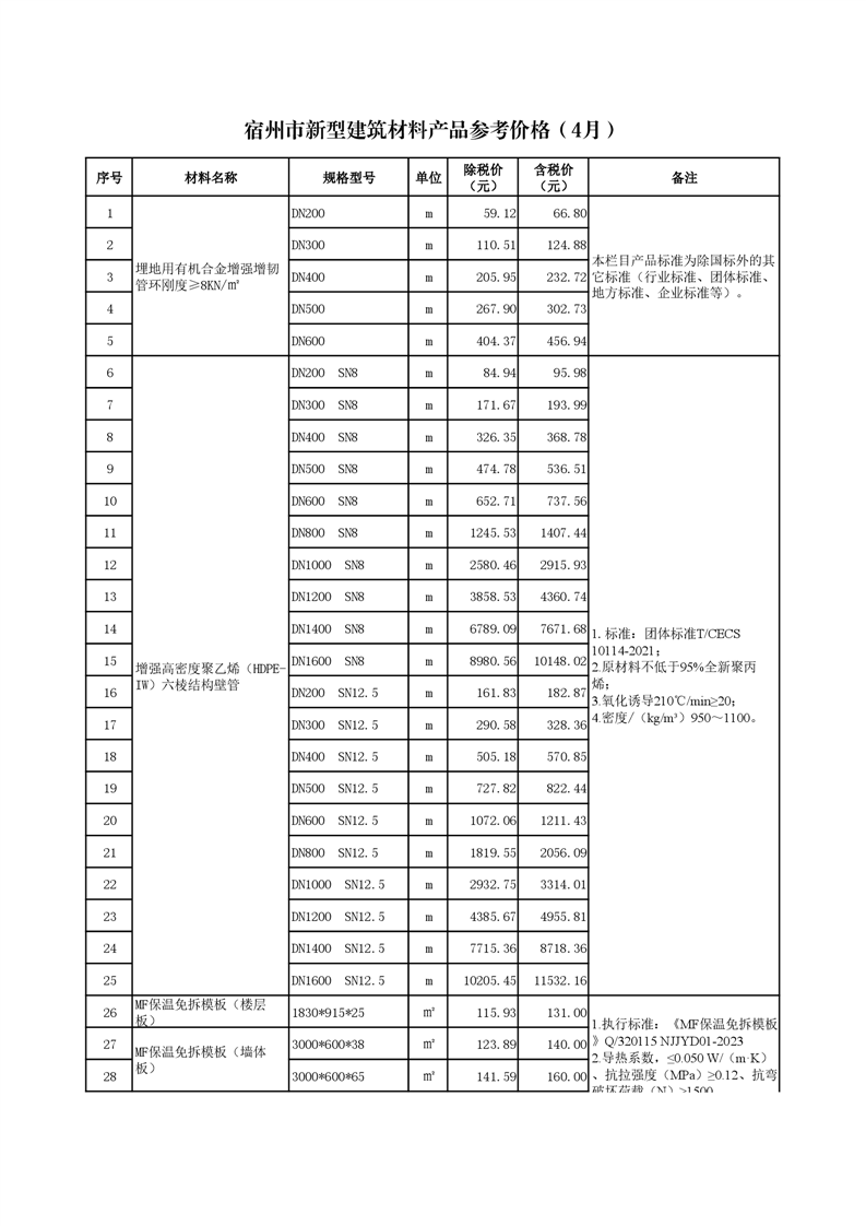 宿州市新型建筑材料产品参考价格(2024年4月)